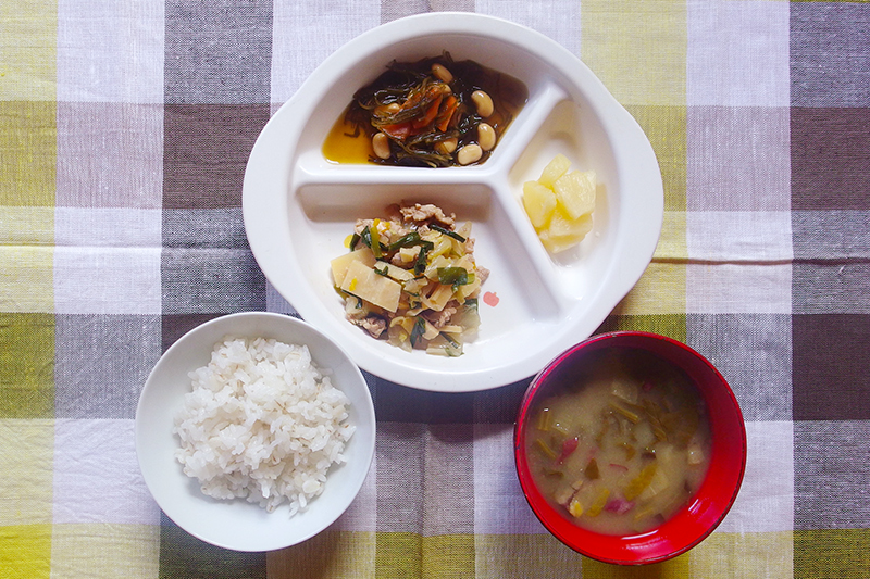 麦入りごはん 豚肉と筍の甘辛炒め こんぶ豆 さつまいもの味噌汁 フルーツ(パイン) \ 5月15日 /