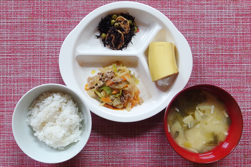 麦入りごはん 牛肉と野菜のケチャップ炒め ひじきとがんもの煮物(海藻メニュー) えのきたけの味噌汁 フルーツ(バナナ) \ 5月30日 /