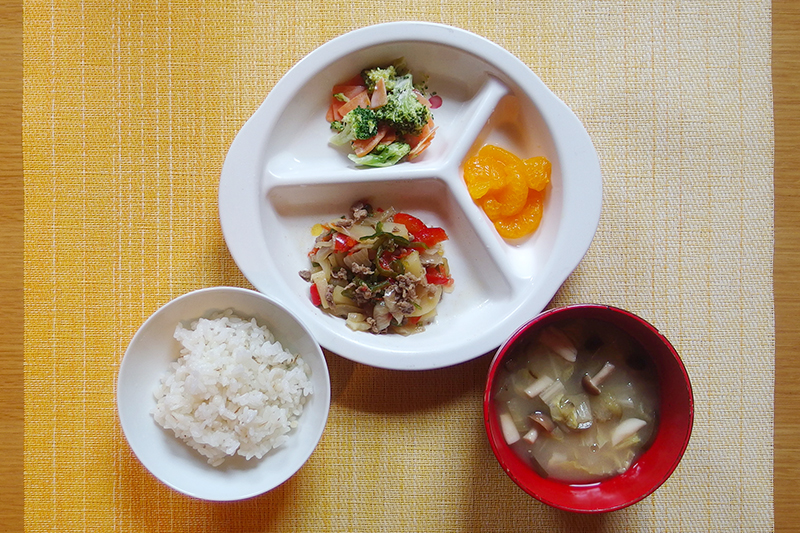 麦入りごはん 牛肉とじゃが芋の甘辛炒め ブロッコリーのマヨネーズ和え しめじの味噌汁 フルーツ(みかん缶) \ 6月26日 /