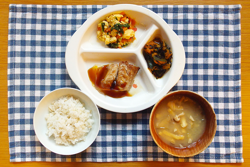 麦入りごはん さばの蒲焼風 卵と野菜のソテー ひじきとかぼちゃの煮物(海藻メニュー) しめじのみそ汁 \ 10月21日 /