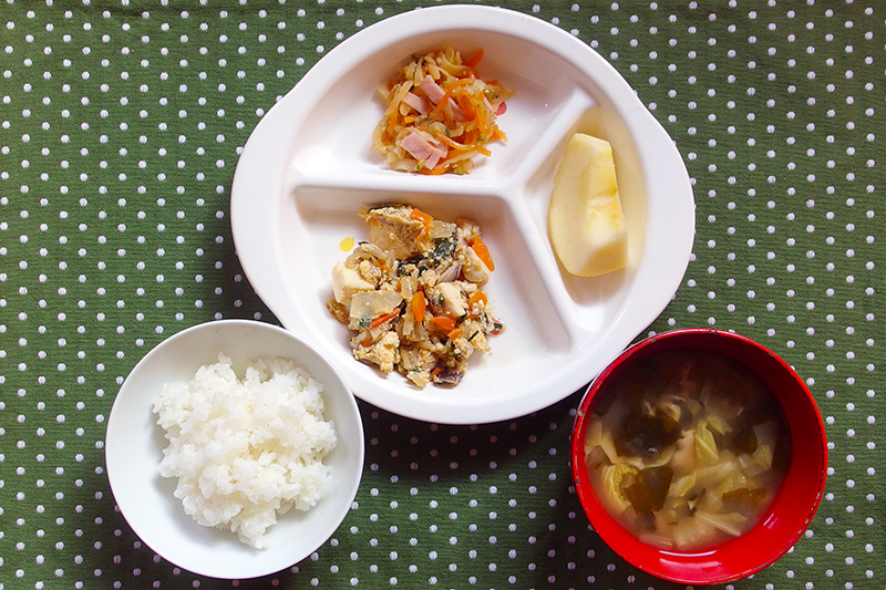 ごはん 豆腐チャンプルー 切干大根のハリハリ和え 白菜のみそ汁 フルーツ(りんご) \ 10月23日 /