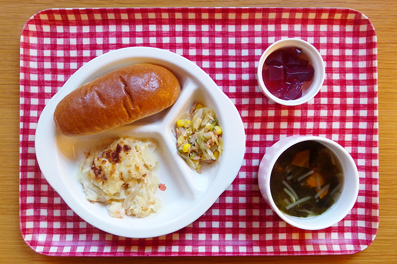 ロールパン えびとじゃが芋のクリームグラタン ツナサラダ もやしのスープ ぶどうかん \ 10月28日 /