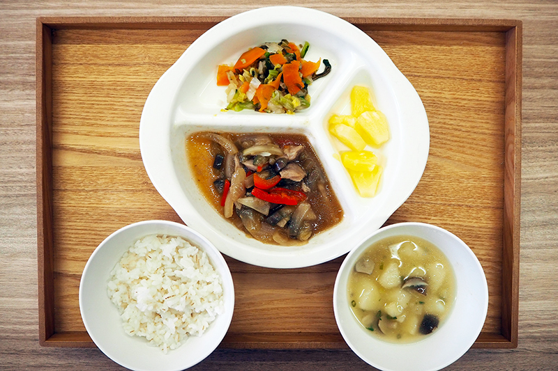 麦入りごはん 鶏肉となすの甘酢炒め 白菜の塩昆布和え しめじのスープ フルーツ(パイン) \ 10月29日 /
