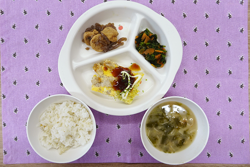 麦入りごはん とん平焼 ほうれん草のおかか和え がんもの煮物 水菜のみそ汁 \ 11月10日 /
