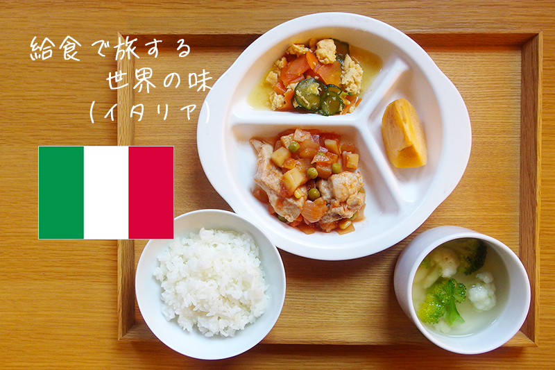 ごはん チキンカチャトーラ(イタリアの料理) 炒り卵サラダ 花野菜スープ フルーツ(柿) \ 11月13日 /