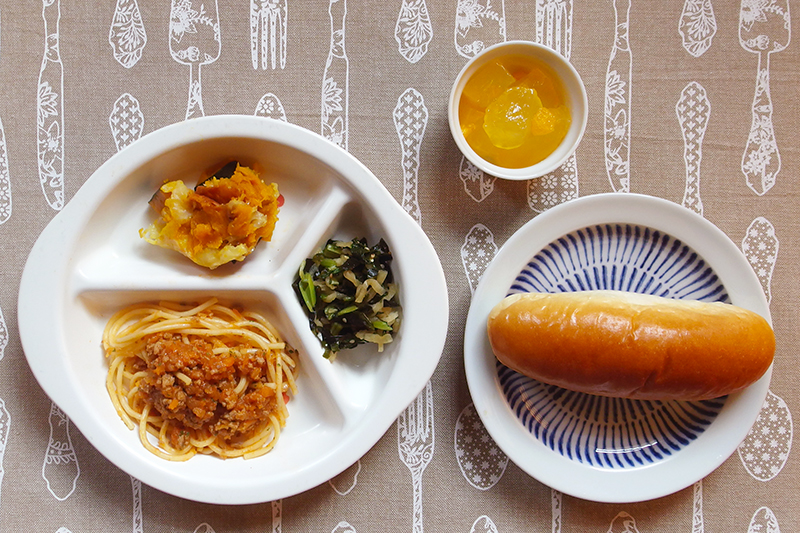 ロールパン スパゲティミートソース かぼちゃのチーズ焼 切干大根のハリハリ和え みかん入りオレンジかん \ 11月19日 /