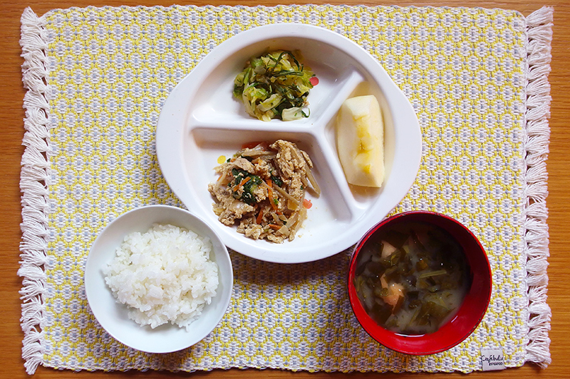 ごはん 豚肉とごぼうの柳川風煮 キャベツの梅風味和え おつゆ麩のみそ汁 フルーツ(りんご) \ 11月20日 /