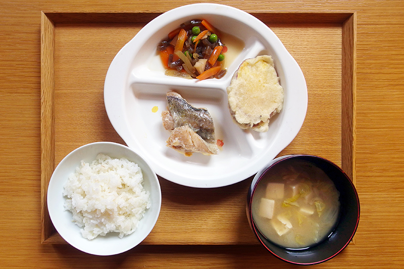 麦入りごはん 白身魚の味付天ぷら 焼さつま芋 高野豆腐と昆布の煮物 白菜のみそ汁 \ 11月7日 /