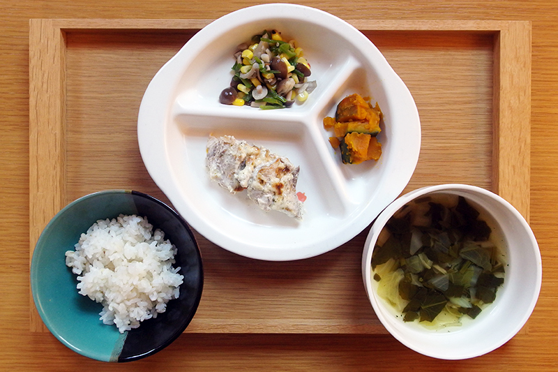 麦入りごはん あじのタルタル焼 きのこソテー(旬メニュー) かぼちゃの甘煮 ごぼうのスープ \ 11月5日 /