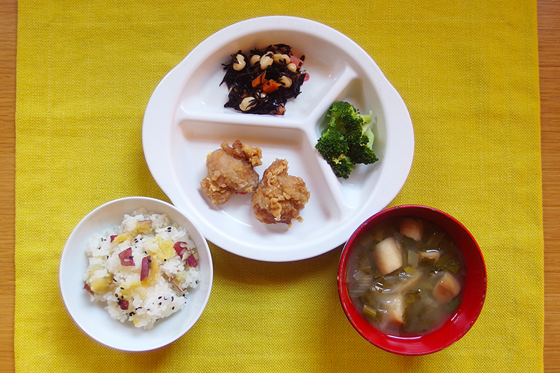さつま芋ごはん 鶏肉の唐揚げ ゆでブロッコリー ひじき豆(海藻メニュー) 玉ねぎのみそ汁 \ 11月6日 /