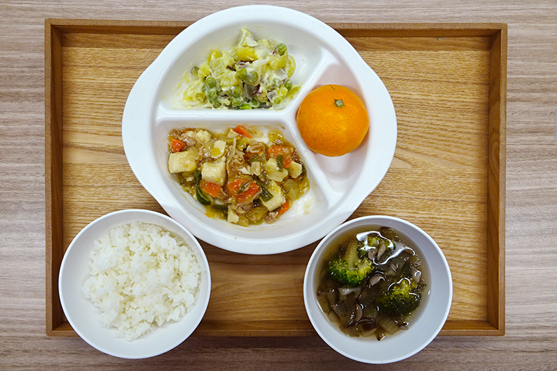 ごはん 豆腐の野菜あんかけ マセドアンサラダ ブロッコリーのスープ フルーツ(みかん) \ 12月11日 / 芋あんかけうどん(あったかメニュー) にんじんシリシリ(人参と卵の炒め物) もやしと胡瓜のあおさ和え \ 12月10日 /