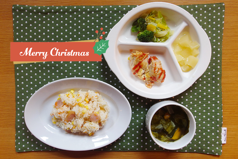 ウインナーとコーンのリースピラフ チキンピカタ キャベツサラダ かぼちゃのスープ パインかん \ 12月24日 /