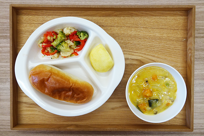 ロールパン 鶏肉ときのこのかぼちゃシチュー 花野菜サラダ フルーツ(りんご) \ 12月8日 /